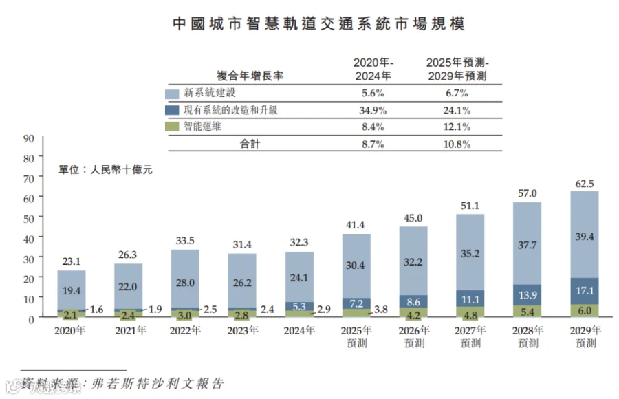 根据弗若斯特沙利文(Frost & Sullivan)报告,在中国智慧轨道交通系统市场中,现有设备的改造升级蕴藏着巨大的市场空间。随着城轨运营里程不断增加,大量早期建设线路的系统已进入寿命末期或技术淘汰阶段。新一代智慧化、自动化设备在安全性、运行效率、数据互联及节能方面优势显著,推动运营单位加快替换老旧设备,实现系统性能全面提升。