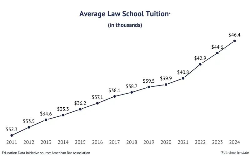 在1996-97至2014-15学年期间,法学院的平均学费上涨了176%,从9,034美元升至23,946美元 -