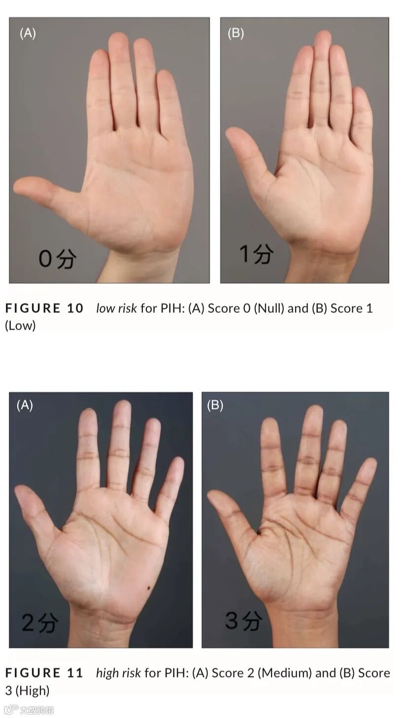 认为可根据掌纹颜色与周围皮肤颜色的差异进行评分,具体为:掌纹颜色与周围皮肤颜色无差异为0分;有轻微差异为1分;有中度差异为2分;有明显差异为3分。分数越低,PIH风险越低,即0-1分风险较低;2-3分风险较高。