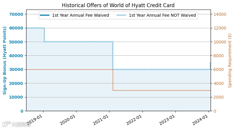 35k+15k 开卡奖励:开卡3个月内消费满 $3,000 可得 35,000 Hyatt 点数;然后开卡6个月内所有消费可得2x点数 up to 30k点数 ($15k 消费)。注意本来所有消费就可以获得1x点数了,所以此offer的后半部分内容仅仅是额外得到1x点数而已,最多得到15k额外点数而已,官网写的30k非常误导人。这就是近期最好的开卡奖励了,历史最好的开卡奖励是60k。