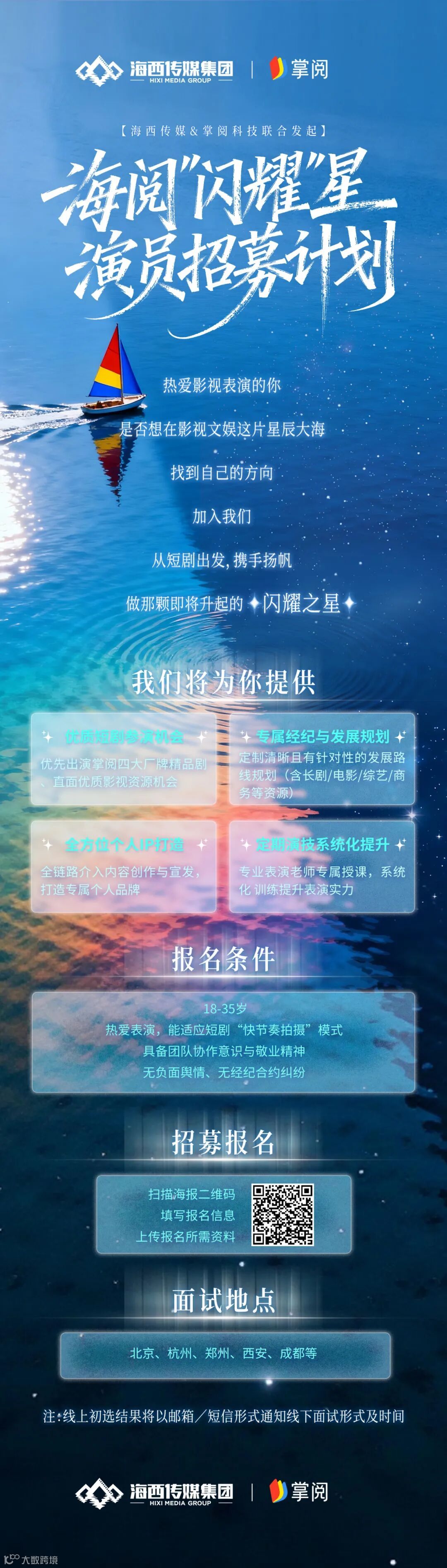 由海西传媒、掌阅科技联合发起的海阅“闪耀”星演员招募计划,现已开启招募。追逐梦想,让热爱尽情释放,从短剧出发,一起携手扬帆,绽放最耀眼的光芒!