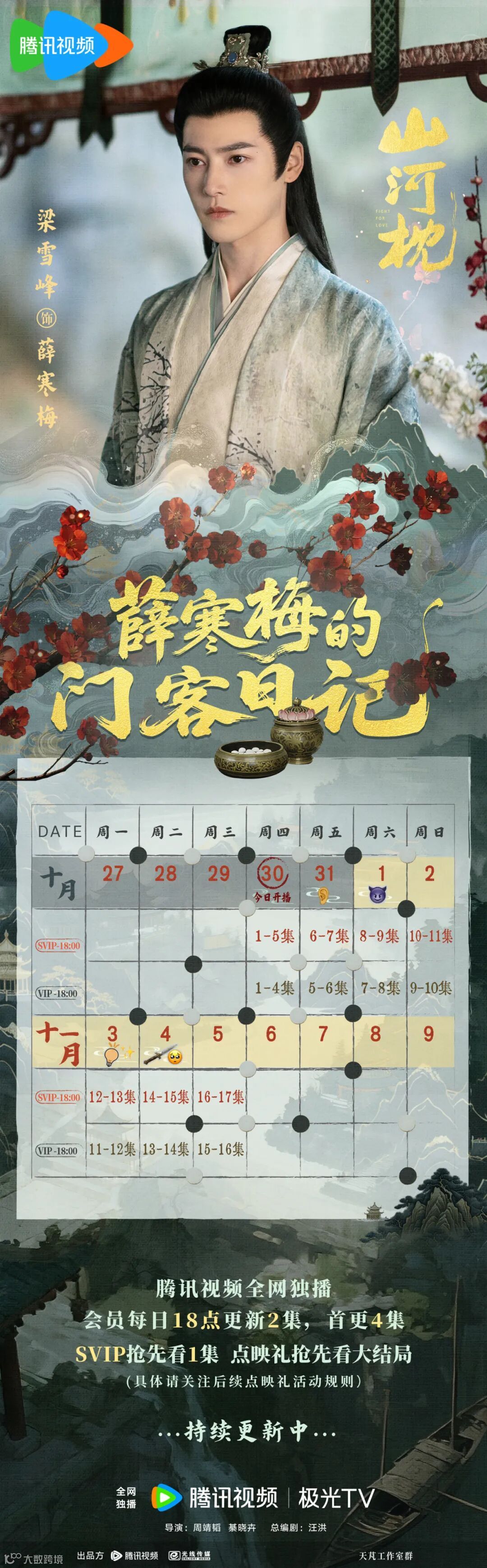 执棋先入局,谋定而后行。《山河枕》正式开播,腾讯站内热度破24000!每晚18:00锁定腾讯视频《山河枕》和梁雪峰饰演的【薛寒梅】共枕山河安。