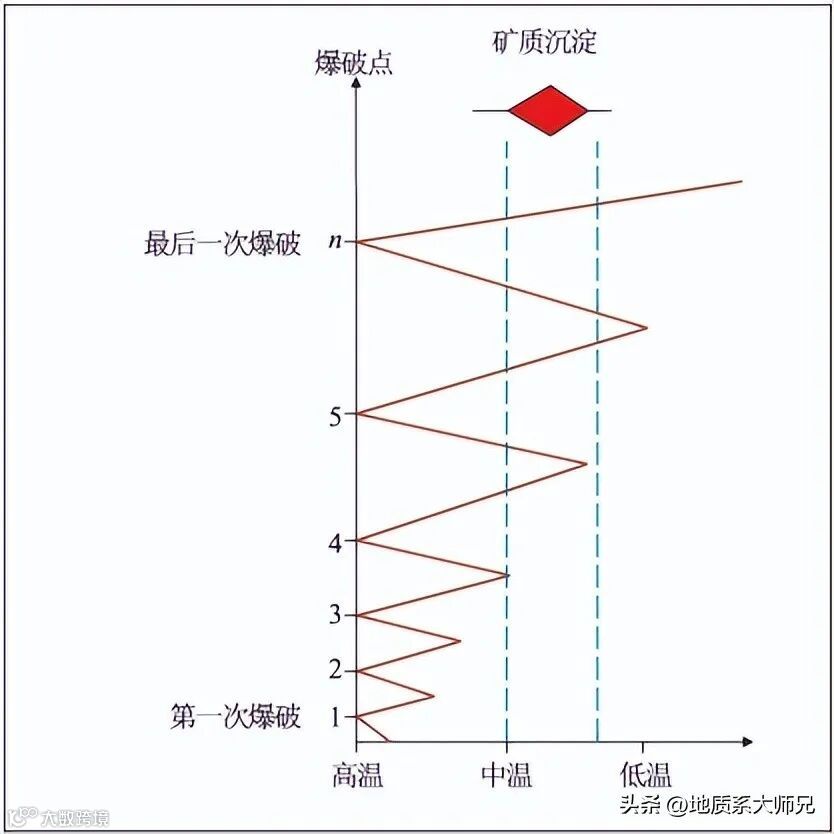 其次,岩浆隐爆作用晚期阶段的热液注入是形成流化侵入角砾岩及其胶结物中金矿物的重要环节,流化作用在该阶段普遍存在,并有证据表明,矿床局部地段可达到注流和喷流,形成流化侵入角砾岩、热液注入角砾岩和热液交代角砾岩。岩浆期后含矿流体充填于开放-半开放的断裂构造或角砾岩体过程中,发生交代作用及流体压力、温度等物理化学条件的改变,导致含金络合物溶解度降低,进而引起矿质沉淀,形成含矿角砾岩体。隐爆角砾岩筒(体)的形成是“能量聚集-爆发-平静”多个爆发旋回的叠加,而流体演化一般也具有“升温-沸腾(爆破)-降温”的演化过程。其中,隐爆角砾岩体的形成在“能量聚集-爆发”或“升温-沸腾”的高-中温阶段,而矿质沉淀主要集中在“爆发-平静”或“沸腾-降温”的相对中-低温阶段(图5)。