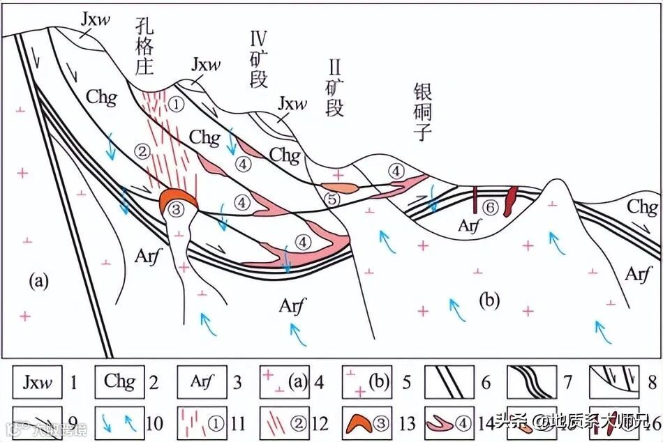1.蓟县系雾迷山组白云岩;2.长城系高于庄组白云岩;3.新太古代阜平变质岩群;4.花岗闪长岩(王安镇岩体);5.花岗闪长岩(柴厂岩体);6.深断裂;7.主拆离带;8.铲状断裂;9.层间滑动断层;10.含矿热液循环方向;11.细脉带型矿体;12.大脉带型矿体;13.隐爆角砾岩型矿体;14.构造蚀变碳酸盐岩型矿体;15.构造蚀变岩浆岩型矿体;16.石英脉型矿体.