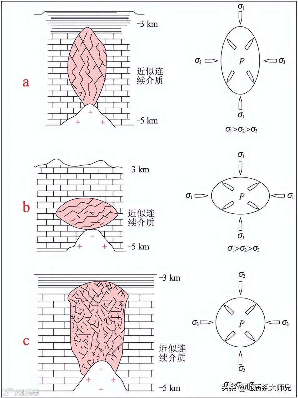 隐爆角砾岩体的成岩-成矿一般包括早期气爆、较晚期浆爆和晚期含矿热液注入。首先,气爆与浆爆主要发生于熔融侵入体的上部。随熔体不断上侵,温压降低,岩浆分异作用或地壳深部部分熔融体的结晶分异不断析出流体,较轻的硅、碱以及挥发分等趋向集中于岩体或熔体的顶部,形成一个概念化的保护水硬壳,有利于后续更多流体和挥发分的聚集;熔体不断上升、冷却结晶,所受压力及挥发分溶解度不断降低,岩浆脱气作用加剧,导致残余熔体发生气泡状的二次沸腾,使熔体顶部保护水硬壳中的流体逐渐趋于饱和,其体积随之迅速膨胀,在其内部产生的剩余压力作用下,这个饱和水的硬壳会发生脆性破裂,成为热液流体脱离岩浆房的通道。当气泡状热液流体沿一定构造侵入熔融体时,会导致其绝热自发性体积膨胀,内压瞬间增大;大约在2km深处,流体压力pf≥σ3(构造正压力)+T(岩石抗张强度临界值),熔体中的水含量达到极大值(2.7%);在深度<2km范围内,pf≫σ3+T(图4),此时内压瞬间释放产生爆破,岩石发生破裂,且驱动裂纹形成并不断向低压、浅部扩展,或使原有的断裂和裂隙重新张开或进一步扩大。形成角 砾系统的复杂程度主要取决于爆破强度,而这与原始岩浆的含水量有关,当岩浆含水量达2%~4%时,其瞬间释放能量可形成复杂的裂隙系统或角砾岩筒构造。