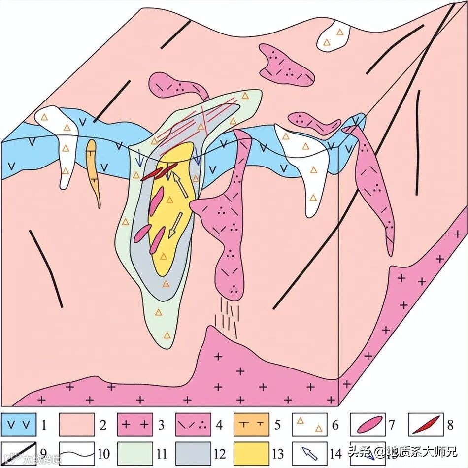 1.安山岩;2.片麻岩;3.花岗岩;4.石英斑岩;5.正长斑岩;6.角砾岩;7.不规则状矿体;8.脉状矿体;9.断裂;10.地层界线;11.青磐岩化带;12.石英黑云母化带;13.石英钾长石化带;14.含矿热液运移方向;15.大气降水运移方向