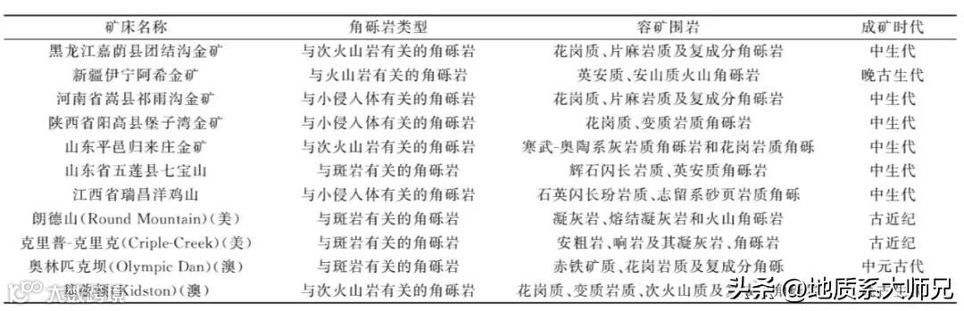 隐爆角砾岩型金矿的成矿时代主要集中于中-新生代,其次为海西-印支期,主要产于火山-次火山环境(表2)。按矿化元素可分为与斑岩系统有关的金-铜成矿系列和与深成侵入相伴的小侵入体有关金-银成矿系列。与矿体具有时空关系的浅成-超浅成侵入体多属壳幔过渡型,岩石化学成分呈高钙碱-碱性特征。部分研究者认为超浅成侵入斑岩的深部可能与更大的隐伏岩体相连通。有些斑岩型矿床的顶部或浅部分布有大量的角砾状矿石(如福建紫金山矿田)。