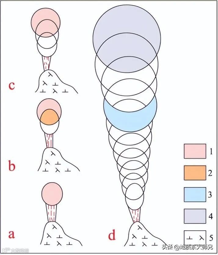 刘国华等认为上述模式是酸性侵入体底侵隐爆作用的形成模式,与其提出的侧向隐爆模式具有一定的相同点和不同点。相同点在于二者的形成均与火山岩区岩体侵入活动有密切的联系,主要由岩浆浅成-超浅成侵位形成的高压挥发分经多次隐爆作用,“由近及远-顺次推进-序次叠加”而成;不同点在于前者常构成侵入体的顶部带,深部一般与侵入体相连,形成“有根”角砾岩筒,矿床顶部或外围可能会有其他脉型矿床,深部可能会存在斑岩型矿床,形成“上部脉型-中部角砾岩型-深部斑岩型”的矿床成矿系统;而后者是岩浆作用过程形成的高温、高压挥发分流体在岩浆侧向产状突变部位聚集,由于液压致裂作用,当流体压力超过岩石静岩压力和抗张强度之和时发生隐爆作用而成;与中酸性斑岩侵入体具有一定的空间关系,但岩筒底部无斑岩而与围岩直接接触,形成“无根”状角砾岩筒,其下一般没有斑岩型矿床(图7)。该研究成果为矿床勘查提供了理论依据。