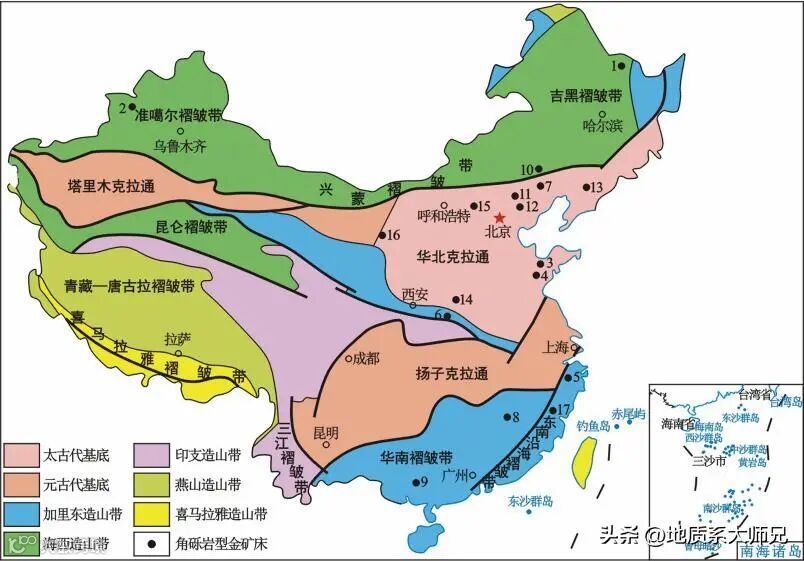 1.黑龙江团结沟金矿;2.新疆阿希金矿;3.山东七宝山金铜矿;4.山东平邑归来庄碲金矿;5.浙江治岭头金矿;6.河南祁雨沟金矿;7.黑龙江东宁金厂金矿;8.江西洋鸡山金矿;9.广西龙头山金矿;10.内蒙古陈家杖子金矿;11.河北省龙王庙金矿;12.河北省宽城县唐杖子金矿;13.吉林三道溜河冰湖沟金矿;14.河南西峡琵琶沟金矿;15.山西阳高县堡子湾金矿;16.甘肃省南山金矿;17.福建政和东际金(银)矿