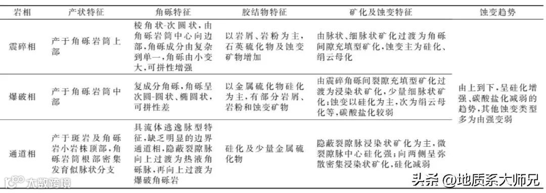 隐爆角砾岩筒的岩相分带具有水平和垂向分带特征。水平分带自边缘向角砾岩体中心一般分为裂隙相、震碎相、爆破相;张会琼等将隐爆角砾岩筒岩相分带从上往下分为裂隙相、震碎相、爆破相和通道相(表4),一般认为这种情况的分带多具有角砾岩筒(体)与围岩渐变过渡的特征,是目前该类矿床岩相分带较为典型的例子。当角砾岩筒以断裂或裂隙与围岩接触时,其界线较清楚,大多数隐爆角砾岩筒岩相分带具有类似特点,只发育前3种或其中几种组合,通道相少见,可能与大多数矿床的揭露程度及其他因素有关。