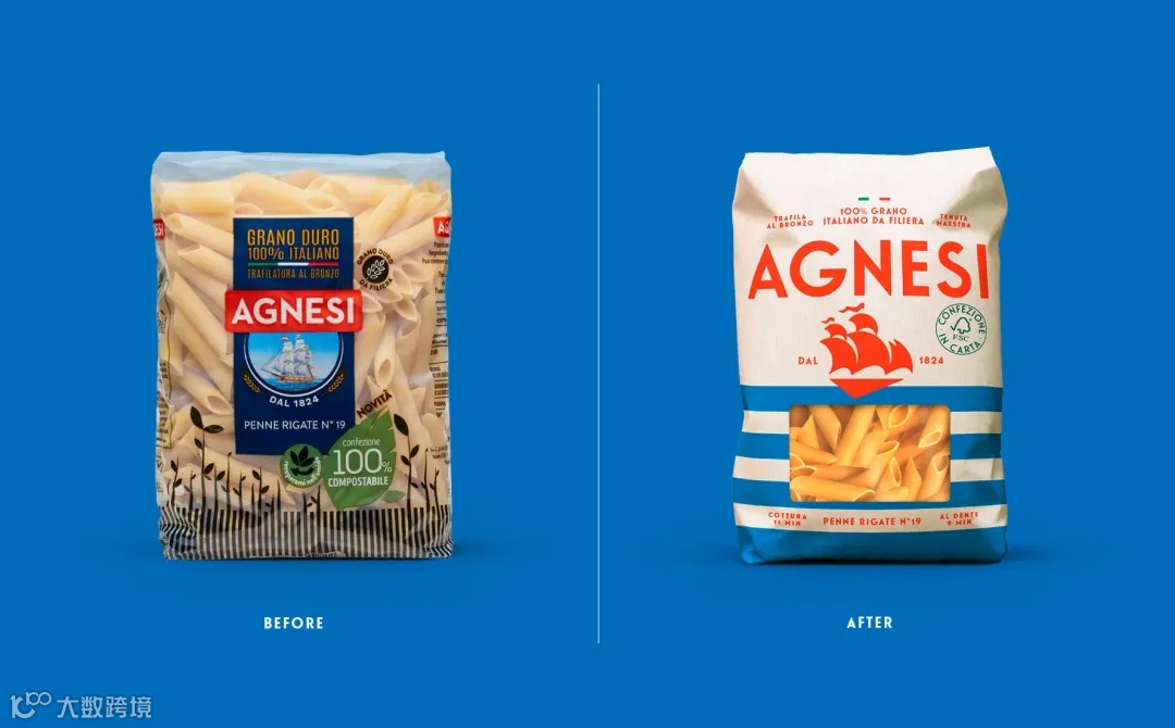最知名的超市意大利面品牌之一Agnesi Pasta通过品牌视觉升级来庆祝其成立200周年。Dieline表示Agnesi的航海新外观非常适合这家意大利公司悠久的传统,同时兼具复古魅力,可以想象它出现在Wes Anderson的电影中。