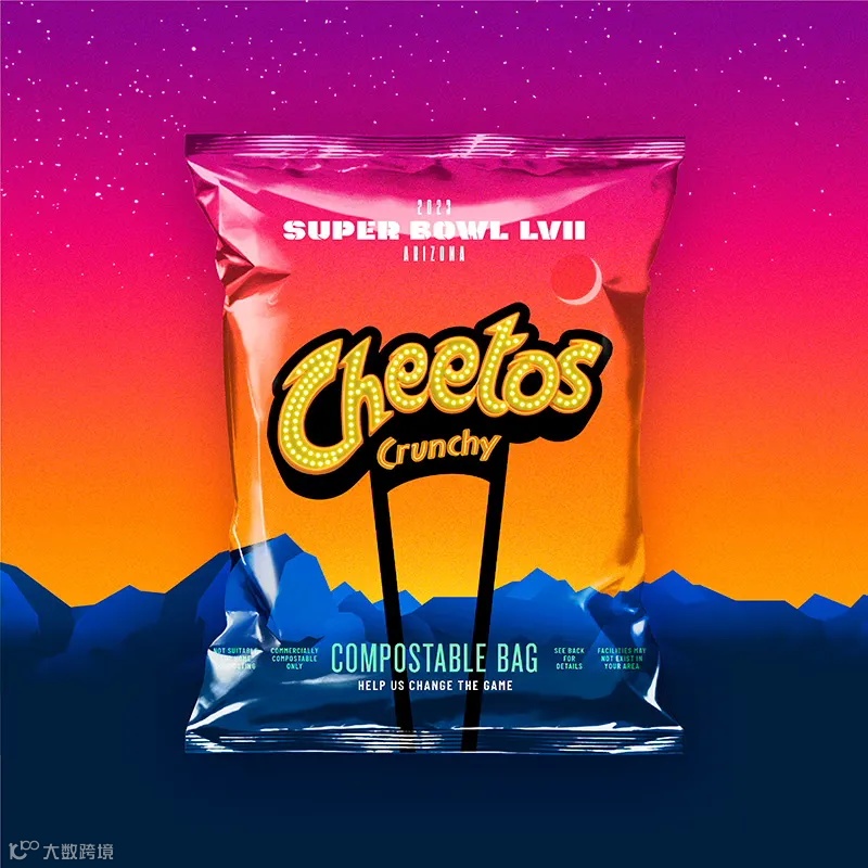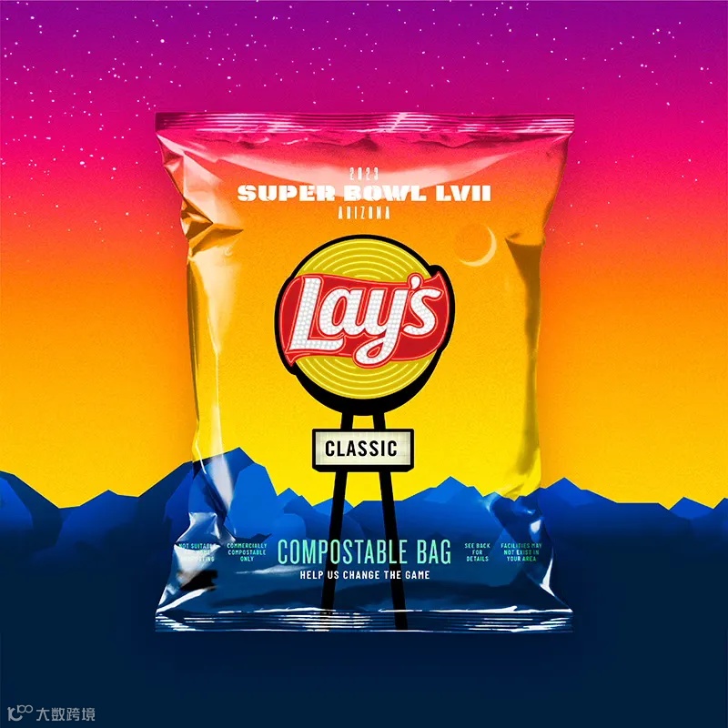 在第五十七届超级碗比赛中,百事公司旗下Frito-Lay为参与者提供了特别版的可工业堆肥取样袋,适用于Lay's®、Cheetos®、Doritos®、Tostitos®和 PopCorners®。这些包装袋是百事公司投资突破性食品包装技术的一个范例,它体现了百事公司的总体pep+目标,即到2025年,在其产品组合中,100%的包装都可回收、可堆肥、可生物降解或可重复使用。与传统包装相比,这些包装袋的原材料生产减少了约60%的温室气体排放。在设计上,设计团队为品牌徽标绘制了66号公路路边标志,包装背景则参考亚利桑那州日落,以吸引人们对大型比赛地点的关注。设计团队重新创作了品牌的所有颜色、形状和字体,通过发光灯泡、霓虹灯管和反光表面等元素,最大限度地增强视觉吸引力。