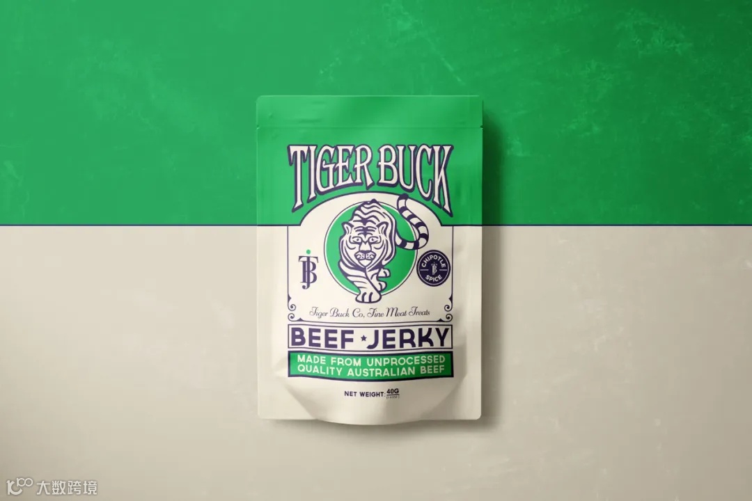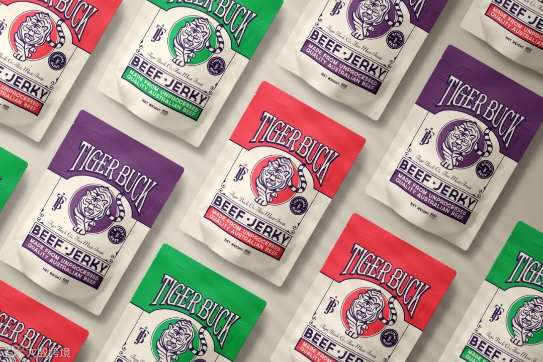 Tiger Buck牛肉干是针对酒吧和美食零售市场开发的。品牌的设计受到美国边疆地区酒吧的纸牌游戏和传统扑克牌设计的影响。醒目的品牌标识清晰易辨,简洁的色调使口味区分更加明确。