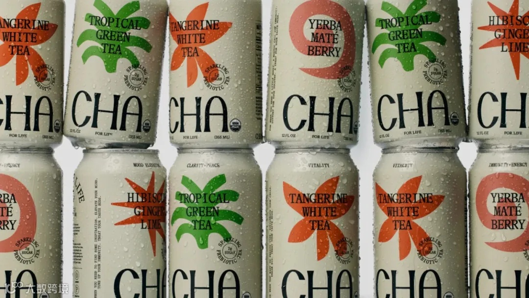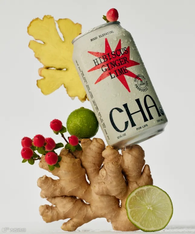 康普茶品牌Better Booch推出新系列“CHA”。“CHA”系列为益生元气泡茶,有4款产品,为铝罐包装。色调上“CHA”系列以白色和黑色为主,“CHA”字样位于底部显著位置,罐子中心印刷着色彩鲜艳的图案,图案暗示了这款产品的口味,口味名称则被印刷在图案上。例如,Tropical Green Tea被写在一个绿色的类似菠萝叶子的形状上,代表热带风情;Hibiscus Ginger Lime被写在一个红色的类似爆炸的形状上,代表着充满活力的烟花。