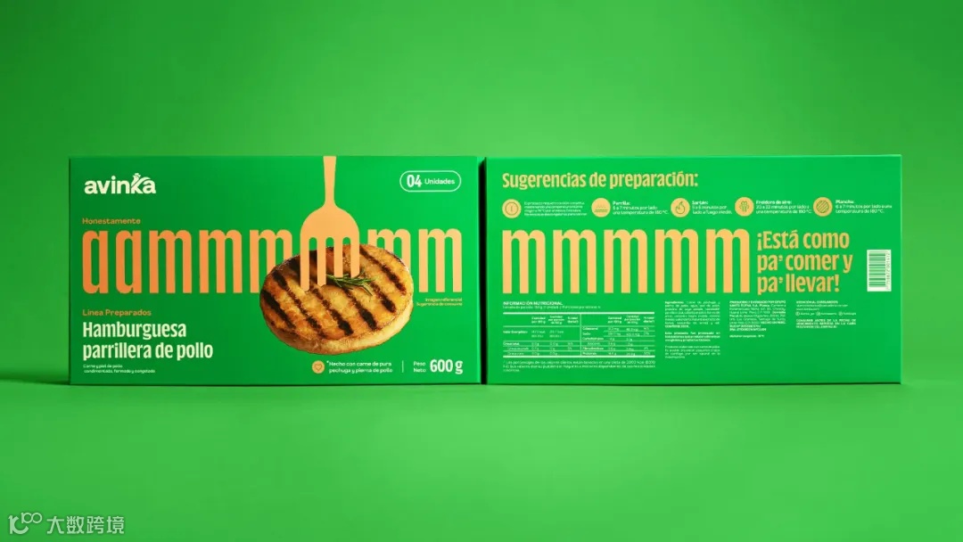 Avinka是秘鲁领先的肉制品品牌之一,因其产品中使用100%的鸡肉而广受认可。据介绍,品牌在进行包装升级中,要求不更换徽标。在设计机构的解决方案中,将人们在享受美食时发出的“mmmmm”、“yummmm”甚至“wowwww”等表达享受的声音与吃饭时用到叉子结合起来,在版面设计中加入品牌的slogan“honestly”,推荐了一种正确的读法来展示品牌的每件产品:“Avinka, honestly mmmmmm Chicken Nuggets”。这使包装不再“哑巴吃黄连”,而是以各种形式流畅地传达了品牌slogan,表达了品牌致力于提供由100%鸡肉制成的美味优质产品的承诺。