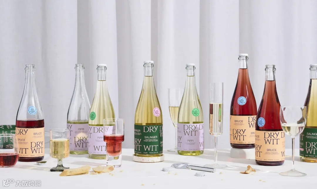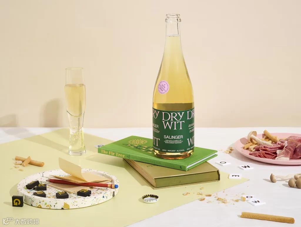 Dry Wit是一款不含酒精的植物与果汁复合饮品,适合在需要葡萄酒的场合上饮用。标签包裹着瓶子,上面印刷着品牌logo和无衬线字体的文字。主标签上方有一张印刷着文字的小贴纸,表明了Dry Wit的特点和含义:“Enjoy yourself and keep your wits about you.”(尽情享受,保持清醒)和“A Non-alcoholic Drink”(无酒精饮品)。