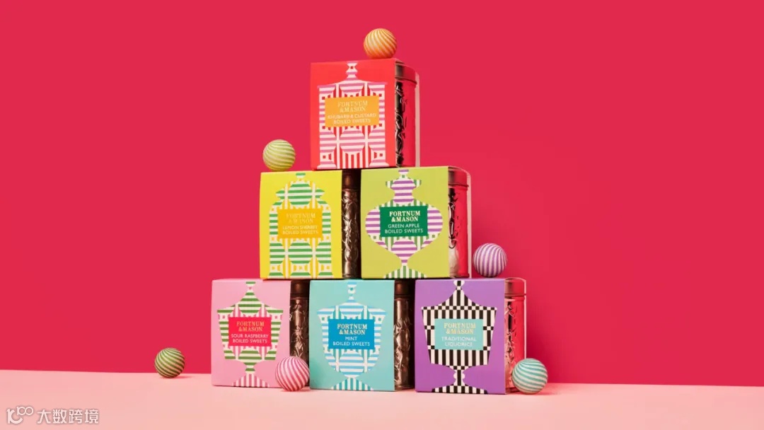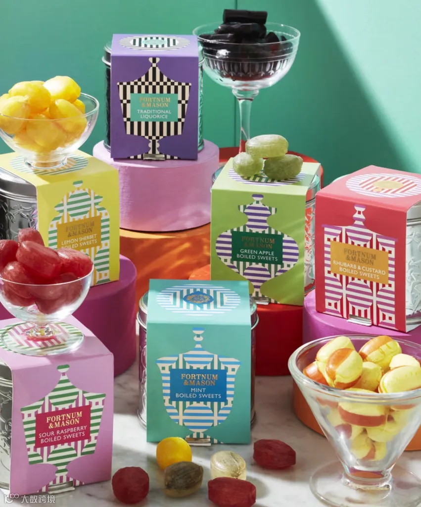 Together Design为Fortnum & Mason设计了糖果礼品系列的包装,该设计是从18世纪百货公司的糖果柜台汲取的灵感,Fortnum & Mason18世纪的百货公司以其糖果柜台而闻名,柜台里摆满了装饰性的糖果罐。包装上采用了各种复古糖果罐形状的图案,色彩活泼鲜明。