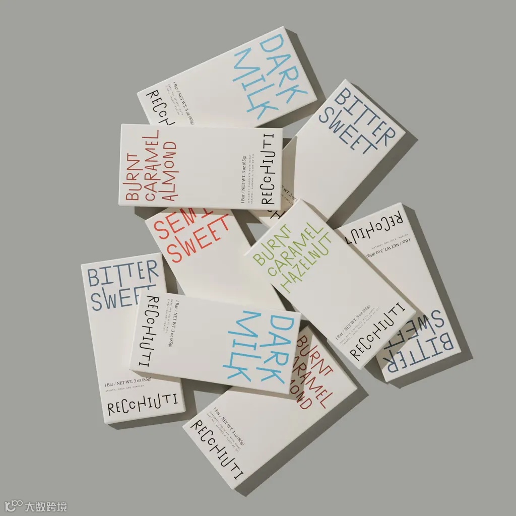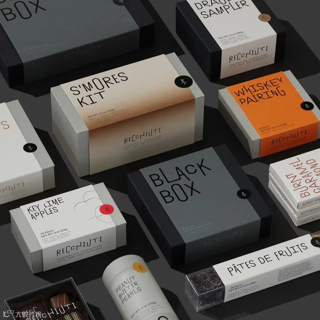 Recchiuti Confections是一家位于旧金山的巧克力店。Manual其重新设计的包装融合了低调的设计元素和独特的细节。最大的亮点是酷炫的交替排版,就像包装盒中的巧克力一样充满活力。一些字母看起来轻松而不张扬,而另一些字母的“茎”和“尾巴”则伸向整个包装盒。这给包装增添了一种生动活泼的感觉。