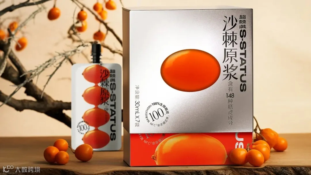超棘满沙棘原浆的外包装为银色套盒,内部为橙色的包装盒。其吸嘴袋包装沙棘果汁将沙棘果连接在一起,形成重复的图案,通过在视觉上垂直排列的沙棘果来传达沙棘果肉的功能属性。沙棘果的图案受胶囊的启发,为消费者营造出一种浓缩和精华的感觉。