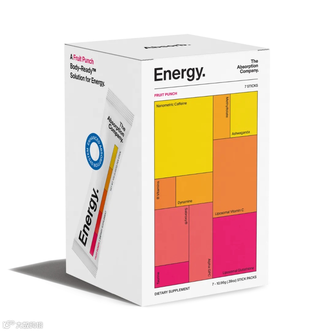 The Absorption Company是一个新的保健品品牌,它声称由于采用了专有的脂质体输送系统,其生物利用率提高了500%。鲜明的白色背景和字体选择让The Aborption Company的品牌形象有点像美国服装公司,但包装盒侧板上的网格系统缓和了这种对比。网格板上的每个方框代表一种补充剂成分,其大小与活性水平相对应。据品牌首席创意官John Scheer介绍,这种呈现方式像是元素周期表与PANTONE色卡的结合。每种配方的色调都受到功能和口味的启发。单独食用的小袋装使用相同的白色背景和字体,但用一排大小相同的方框取代了网格布局,使人联想到试纸的色调。