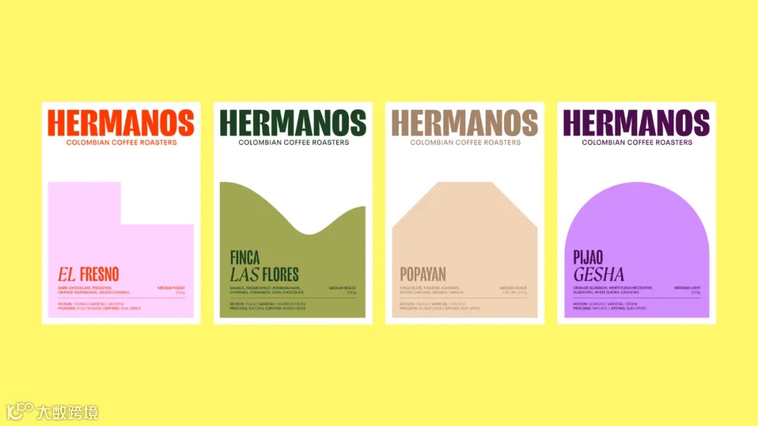 随着Hermanos Colombian Coffee Roasters品牌扩展到整个伦敦,Fellow对其包装设计进行了改造。从周边地区和城市的自然景观和亚文化中汲取灵感,设计了与这些地方相呼应的色调和排版风格,借鉴了街头艺术和店面颜料装饰中使用的粗体字体。在字体设计方面,采用了双语方法,将无衬线字体和有衬线字体结合在一起。在项目的概念阶段,保留了品牌的视觉代表象形图,以矢量形式展现了创始人的形象。