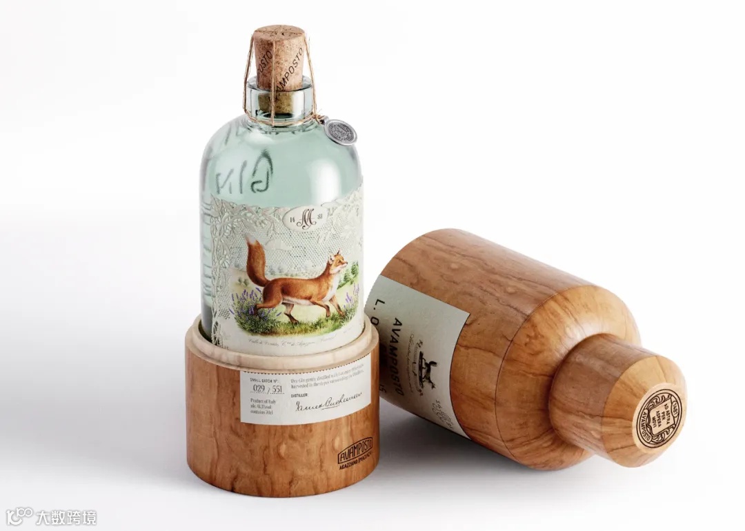 Avamposto金酒中添加了当地的植物和薰衣草,这些植物和薰衣草都是在Avamposto自己的酿酒厂周围的山坡上采摘的。Avamposto金酒酒瓶是采用回收玻璃制成,具有天然的蓝色色调,背面压印设计提供触感体验。酒瓶上的插图受John James Audubon的自然插图启发,是对Avamposto山谷的描绘。酒瓶标签的灵感来自于18世纪的纸质祈祷卡,还采用了镂空和雕刻浮雕技术。软木塞上印有品牌名称,并用线和金属硬币密封。