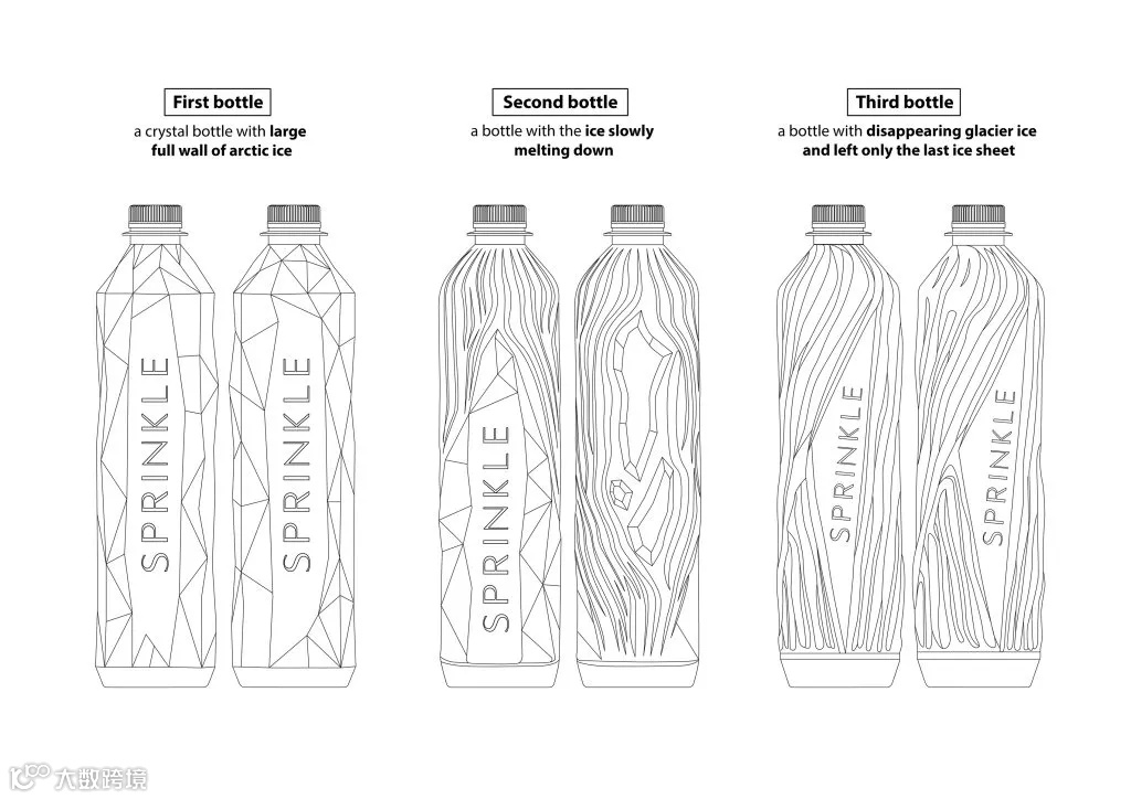 Sprinkle采用的是透明、无色、无标签、易回收的包装,据创意机构介绍,其设计是在“REDESIGN TO REDUCE”的理念下,用北极冰雪消融的情景故事来提醒人们关注世界气候变化,并在瓶身表面设计了以下三种情景:第一个瓶子是一个水晶瓶子,瓶子壁上有大片北极冰;第二个瓶子是冰慢慢融化的瓶子;第三个瓶子是冰川冰层消失,只剩下最后一块冰层的瓶子。瓶造型的动画插图不是常规的传统强化图案,而是一种复制冰融化表现形式的雕塑设计。条形码使用可清洗油墨印刷在瓶盖上表面。