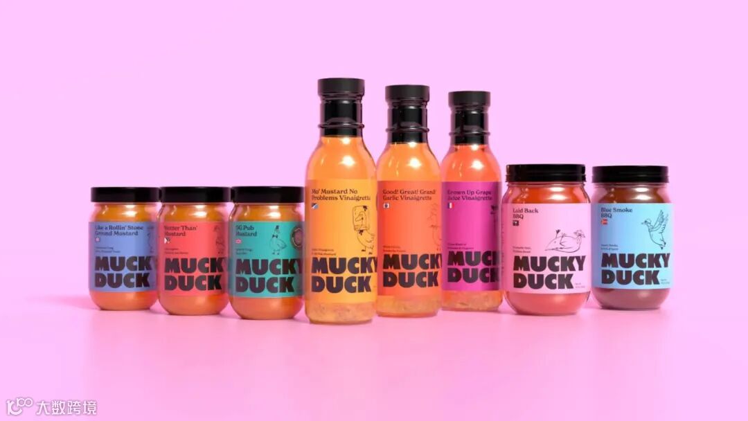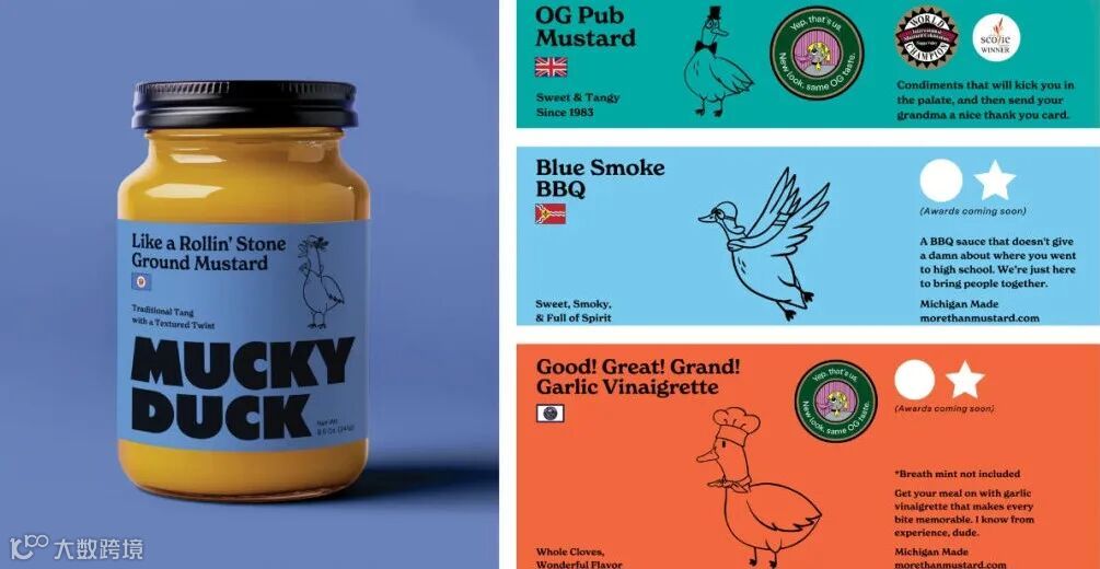 酱料品牌Mucky Duck在其各种口味的产品中加入了许多有趣的鸭子形象,Mucky Duck是一个拥有40年历史的老品牌,在当地有着悠久的历史。在品牌40周年之际,品牌的标志性鸭子图案焕新了,插图中鸭子们身着各种服装,如经典的飞行员或厨师造型,而鲜艳的色彩则区分了每种口味。徽标采用无衬线字体,其他细节则采用优雅的衬线字体。