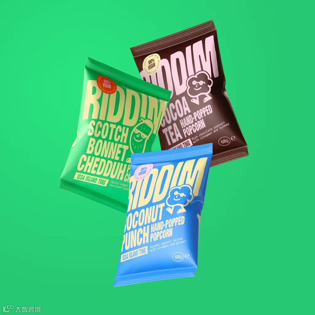 Riddim是一家巴哈马零食公司,主营植物基薯片和手工爆米花。其包装设计简洁而引人注意,双色色调、有趣的产品插图和无衬线布局都很有冲击力。品牌与插画家Lucy Letherland合作,创作了两个人物形象来表达创始人的个性,包装视觉系统形成了鲜明的对比,大胆的字体为拟人化的零食形象和怀旧风格增添了优势和老少皆宜的吸引力。
