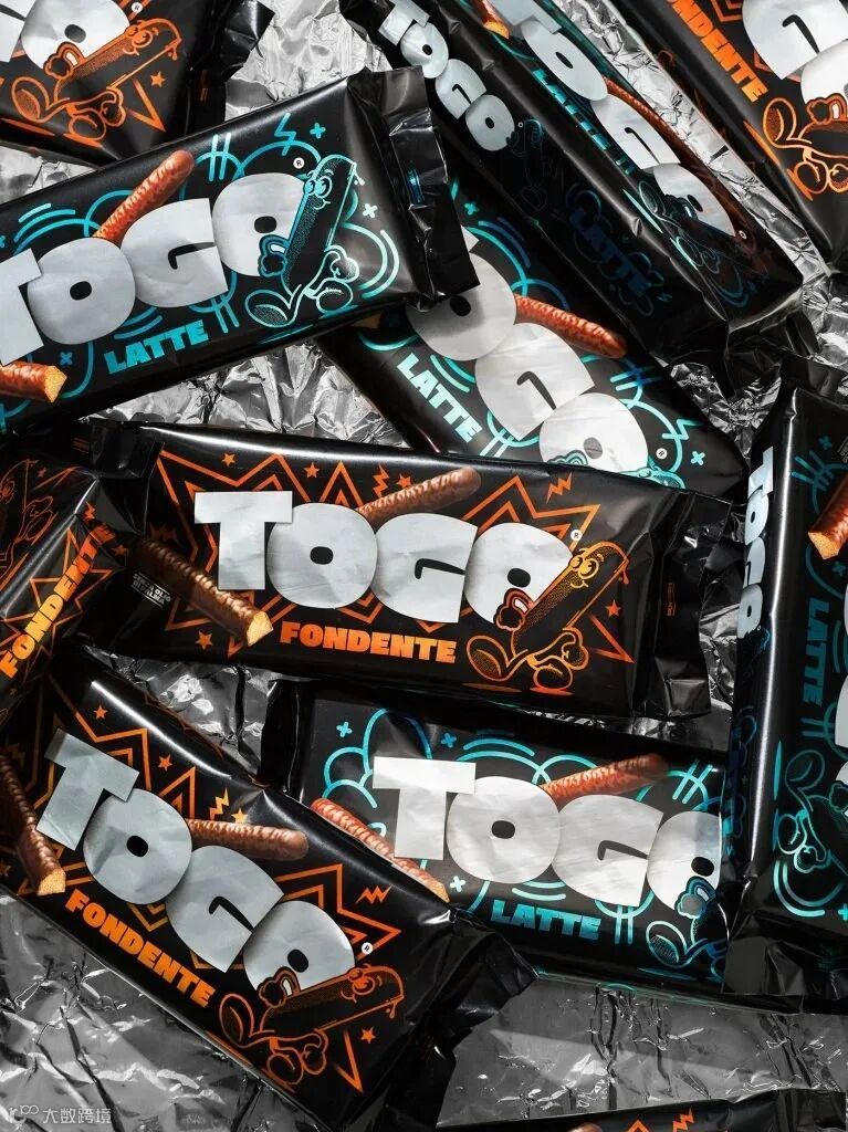 意大利Marimo公司为Barilla旗下历史悠久的巧克力品牌Togo进行了视觉升级,新视觉采用了鲜艳的色彩(蓝色代表拿铁咖啡口味,橙色代表Fondente口味)、动态的插图细节和新的徽标,表达丰富的个性。旧的品牌形象带有20世纪巧克力包装的经典风格,而更现代的重新设计则使用了涂鸦式的细节和大胆的无衬线字体来吸引眼球。