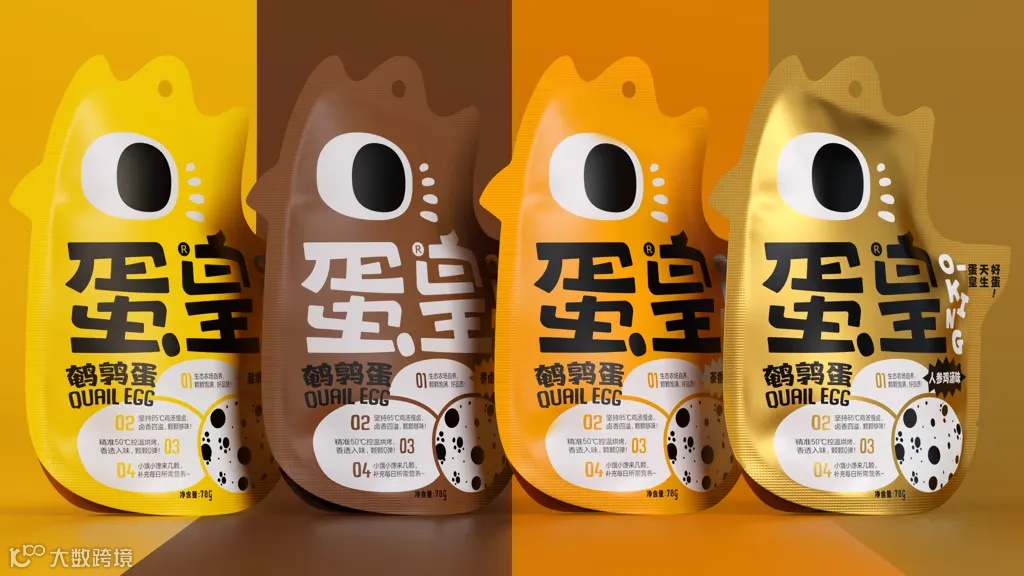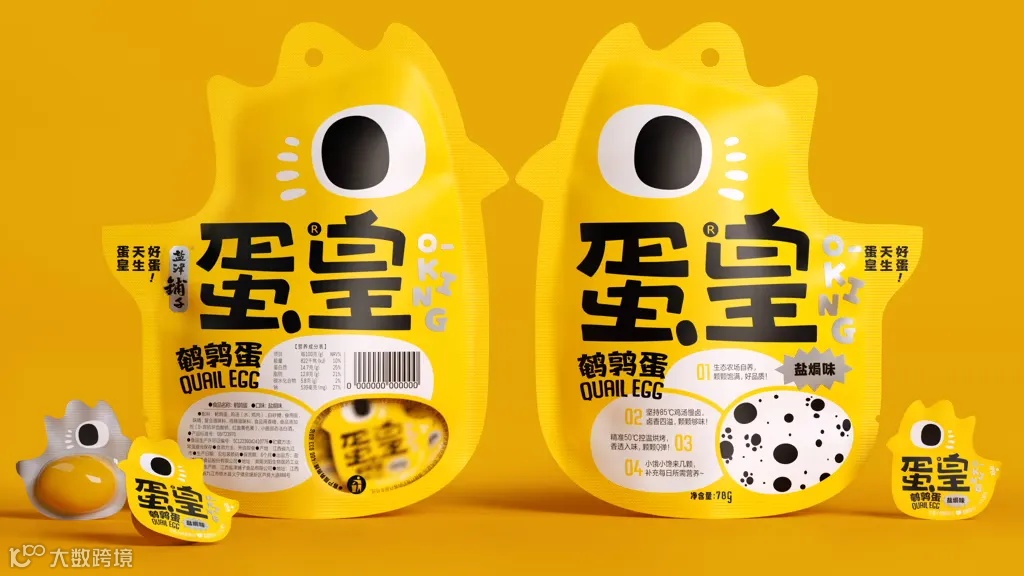 蛋皇是盐津铺子于2024年1月新推出的子品牌,包装设计由潘虎设操刀。在包装设计上采用了异形包装,在视觉策略上采用“一眼即蛋皇”的策略,将鹌鹑形象化,对鹌鹑的外形进行了概括,有趣地将原本呆板的形象转化为更能让消费者留下深刻印象的形象,增强了与消费者的互动性,打破了鹌鹑蛋类产品包装的刻板印象。
