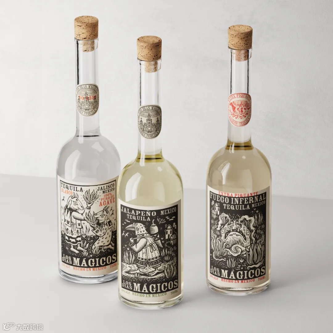 设计机构denomination为Fourth Wave的龙舌兰酒品牌设计了包装,并命名为Los Dias Magicos。Los Dias Magicos的命名策略是与龙舌兰酒的起源联系起来,龙舌兰镇被墨西哥政府命名为“Pueblo Mágico”,因此“Los Dias Magicos”这个名字反映了它的历史和位置。酒瓶标签的排版处理故意显得粗糙,以尽可能呈现手工制作的效果。文字的位置故意错开,看起来好像是在插图中穿插,就像手工印刷时,印刷版的位置发生了变化。
