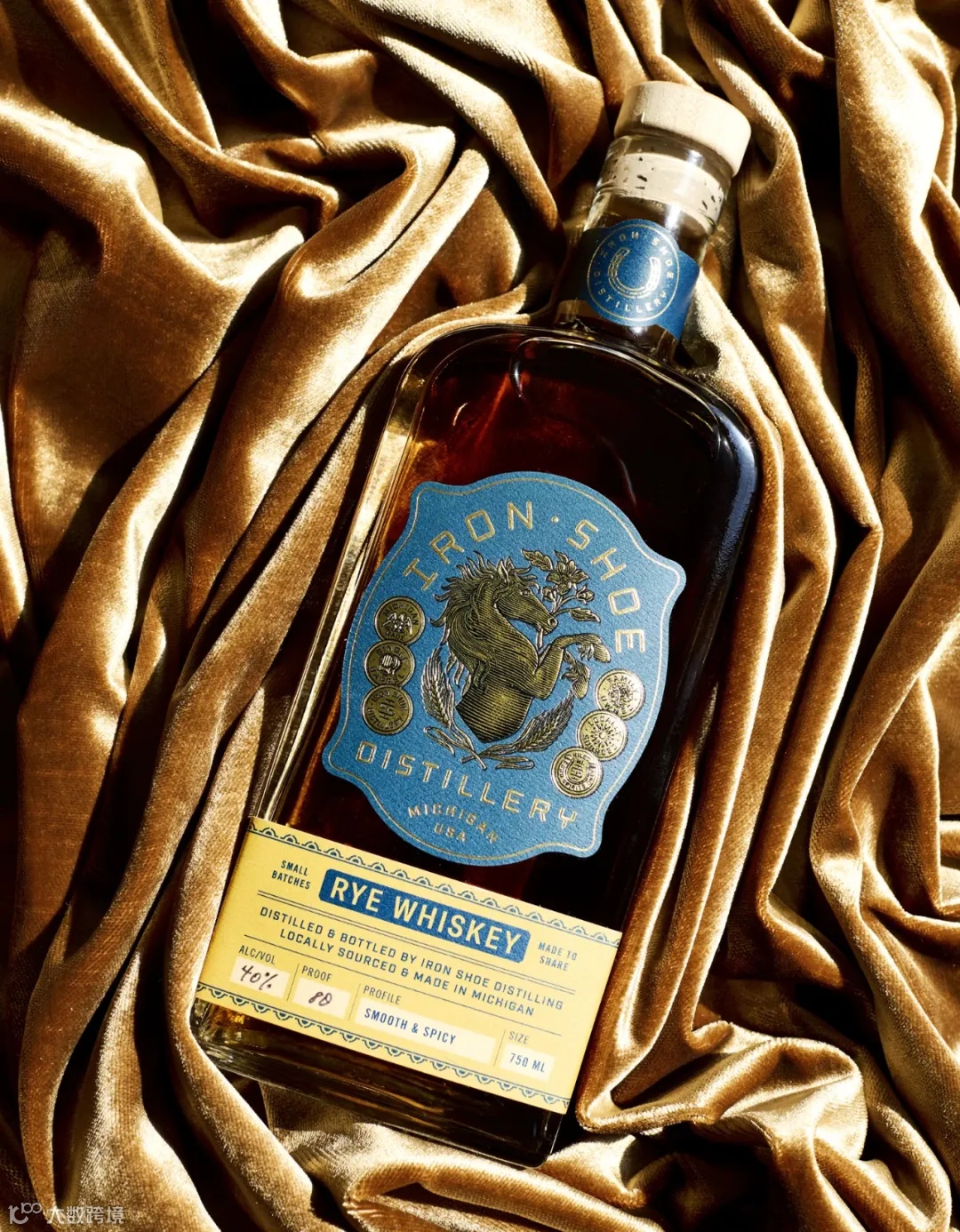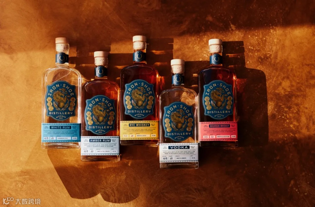 设计机构Atlas Branding与密歇根州酒厂Iron Shoe Distillery合作,为其重新构想了一套设计系统,在更新包装的同时展现其根深蒂固的社区价值。Iron Shoe Distillery所使用的谷物全部来自酿酒厂附近10英里范围内的密歇根州农场。酒瓶包装采用了复杂的浮雕,标签中心用箔印雕刻描绘了一匹咬着一朵苹果花(密歇根州的州花)的骏马,背景为牛仔蓝色,与金箔马形成鲜明对比。该系列中的所有烈酒都使用相同的颈部和徽章标签。