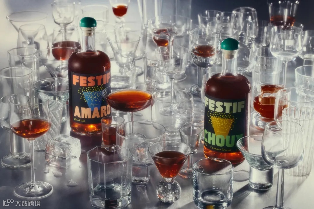 Festif是一个新餐后开胃酒品牌,品牌名称Festif在法语中意为“欢乐”,体现了品牌的庆祝精神。设计机构Wedge从20世纪20年代的欧洲海报中寻找灵感,以营造品牌的欢乐精神。Festif的酒瓶标签采用了梯形设计,让人联想到通常用于盛放开胃酒的玻璃器皿。两款产品标签上图案的颜色各不相同,amaro酒瓶采用了蓝色,choux酒瓶采用了黄色。梯形标签的上方有一圈黄色的圆点,给人一种愉悦感。Festif的酒瓶标签的字体采用脚本字体,大而醒目,排列在酒瓶的顶端和底部。