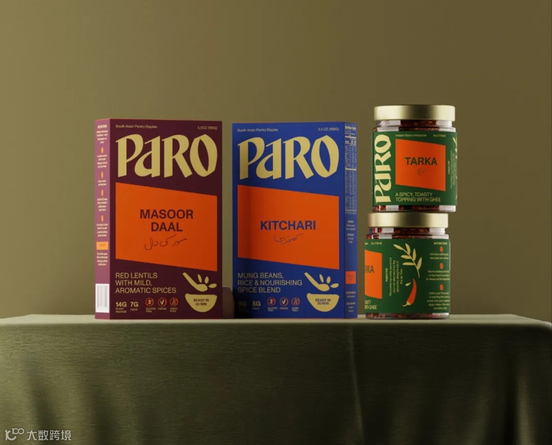 Paro是一个南亚方便主食新品牌,其品牌和包装由设计公司Wedge负责。据介绍,该产品设计从巴基斯坦的复古食品中汲取灵感。包装和视觉设计的灵感来自香料和巴基斯坦纺织品,设计有意迸发出绚丽的色彩,凸显浓郁风味。包装结合了温暖和朴实的色彩,如Massor Daal的暗红色、Kitchari包装盒的蓝色和Tarka标签的绿色。所有包装上的Paro徽标和文案都是黄色的,包装正面的橙色平行四边形是产品的英文名称,由创始人Sharwani的母亲用乌尔都语书写。