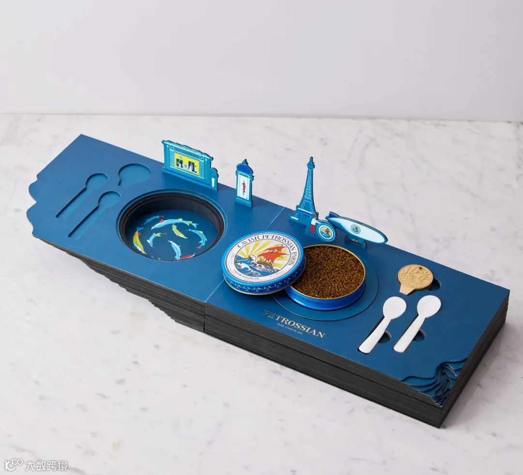 这是一款鱼子酱的创新包装,品牌使用了海浪、鱼等关键的视觉小元素,并突出其中的鱼子酱。既是一个故事,也是对鱼子酱的精彩展示。