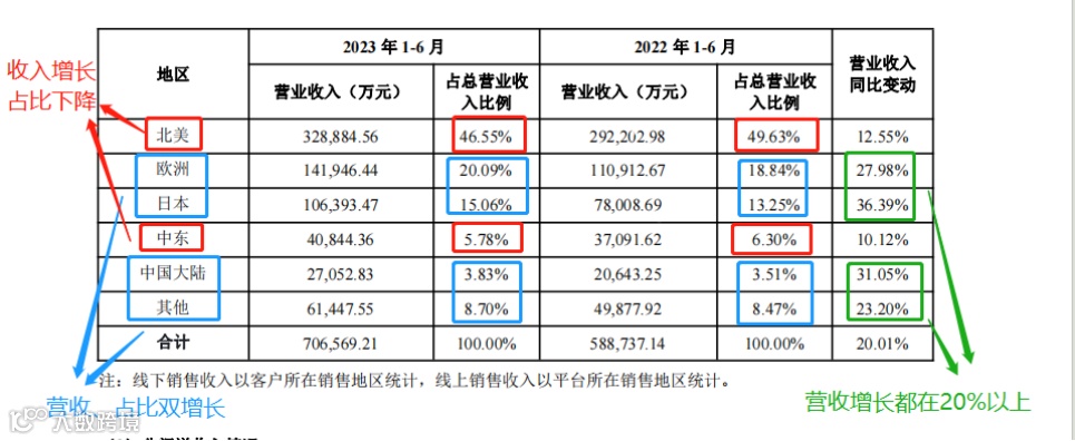 今年上半年,报告期内安克在北美地区和中东地区的营业收入稳步增长,其中北美依然是占总营业收入比例最高的区域,但相较去年同期占总营业收入比例下降;而欧洲、日本、中国大陆和其他地区市场的营收、占比都在同步增长,营业收入同比变动都在20%以上。