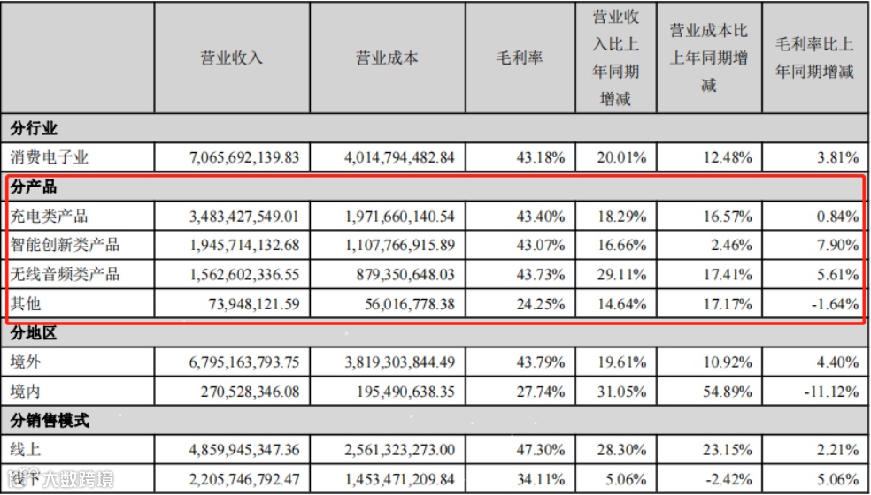 财报显示,充电类产品仍是安克创新的主要收入来源和持续、重点发展的产品领域。上半年安克充电类产品实现收入34.83亿元,同比增长18.29%,占总营收的49.30%。