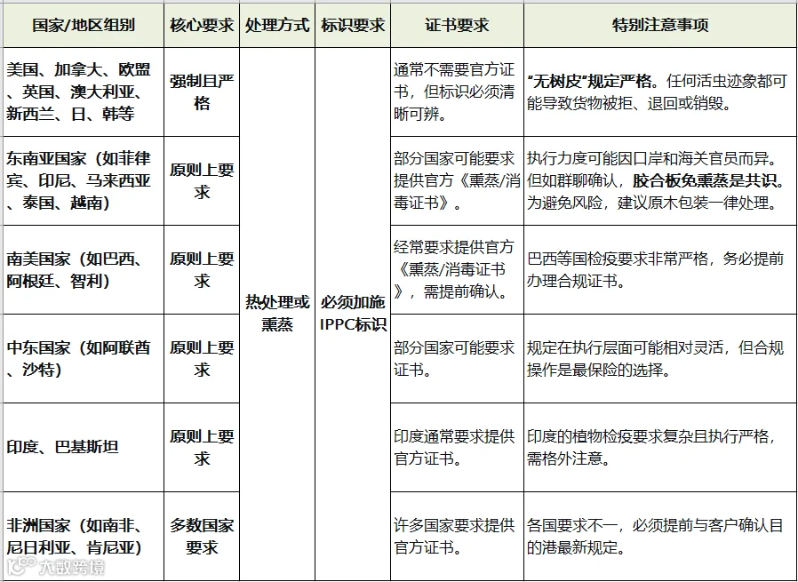 以菲律宾为例,虽然原则上要求木质包装进行处理,但对胶合板等人造板材料免除此要求,如群聊中确认的情况。