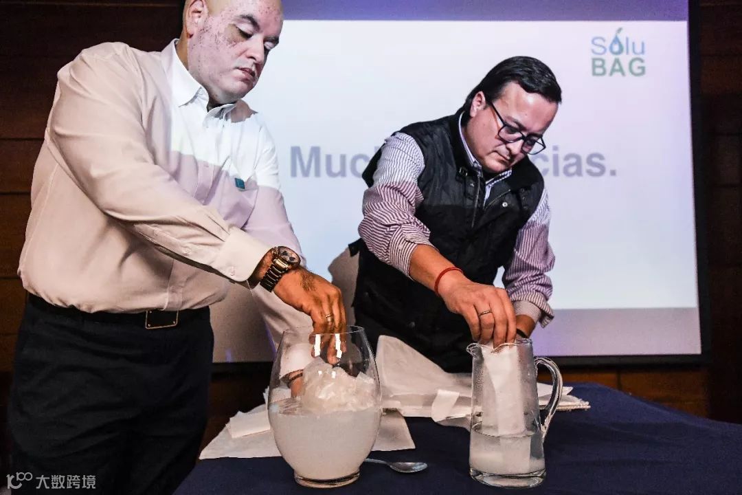 据智利SoluBag公司总经理罗贝托·阿斯泰特介绍,一个普通塑料袋需要400年才能降解,而一个聚乙烯醇水溶袋仅需5分钟即可完成降解。他还多次演示了该购物袋遇水溶解并饮用液体的过程。