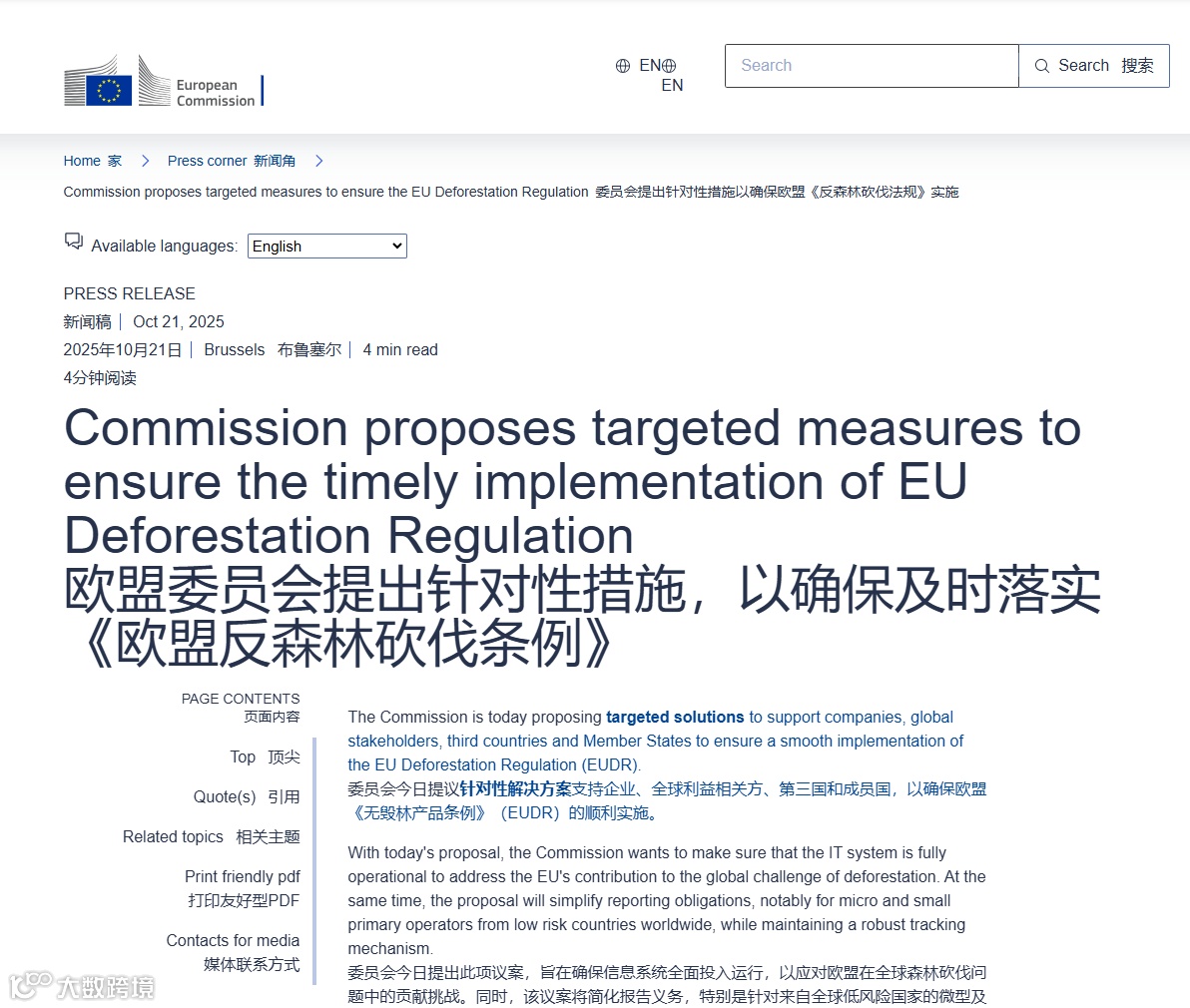 欧盟零毁林法案(EU Deforestation Regulation简称EUDR),是欧盟“欧洲绿色协议”核心环保政策,通过严格管控供应链,遏制森林砍伐与退化,应对气候变化、保护生物多样性。