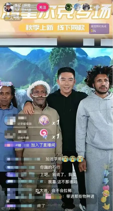 近日,拥有600多万粉丝的探险博主李忆将印尼巴布亚原始部落的三位成员带入直播间,为鸿星尔克秋季专场带货[k]。三人虽不懂中文,直播中主要由李忆介绍产品,但他们身着现代服装仍保留脸部彩绘、鼻穿野猪牙等部落特征,配合音乐载歌载舞,形成独特视觉冲击[k]。