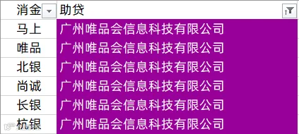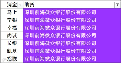马上消费、南银法巴消金、宁银消金、中银消金、兴业消金、幸福消金、唯品富邦消金、北银消金、平安消金、锦程消金、中信消金、金美信消金、尚诚消金、长银消金、中原消金、杭银消金、苏银凯基消金、招联消金、中邮消金、哈银消金
