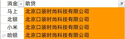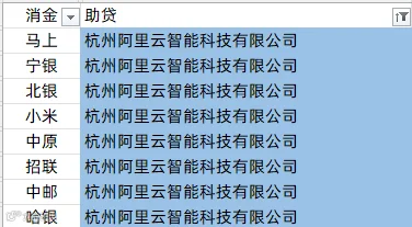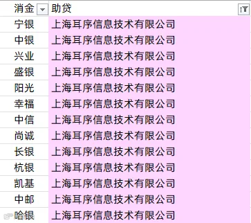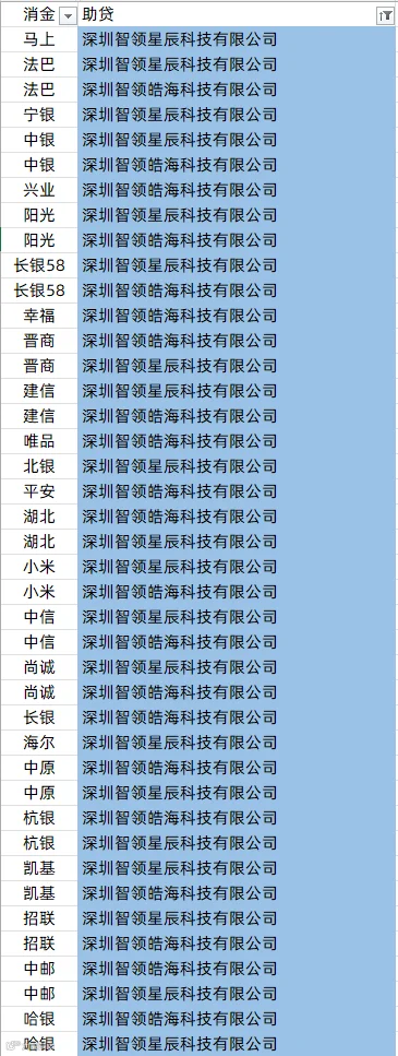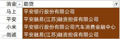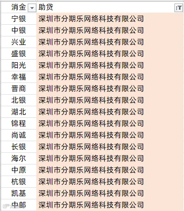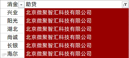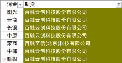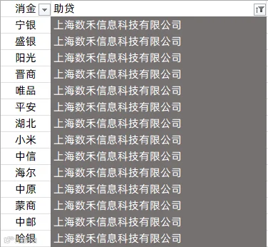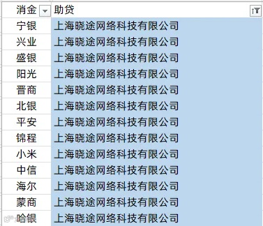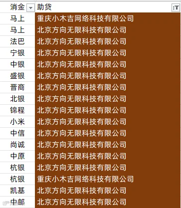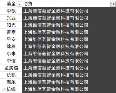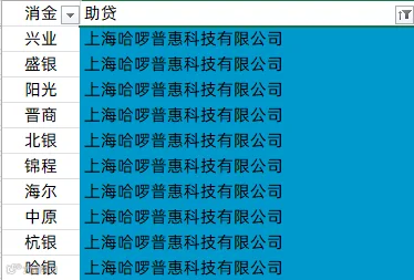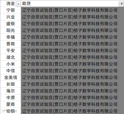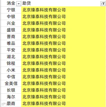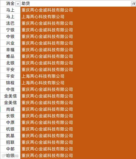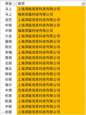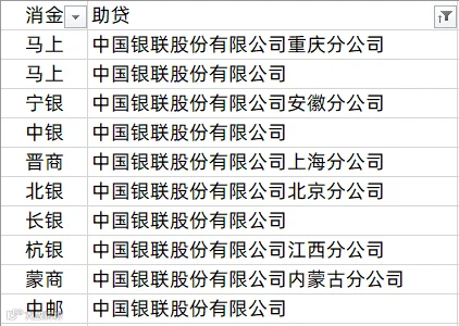 中银消金、兴业消金、阳光消金、晋商消金、平安消金、锦程消金、小米消金、中信消金、金美信消金、长银消金、海尔消金、杭银消金