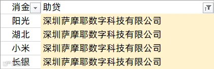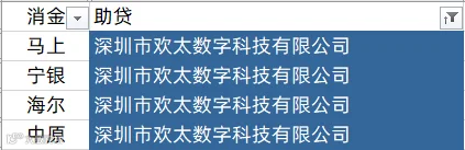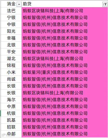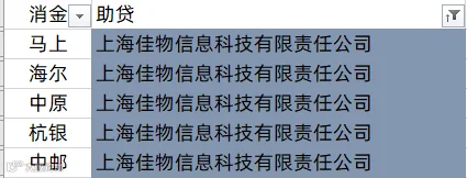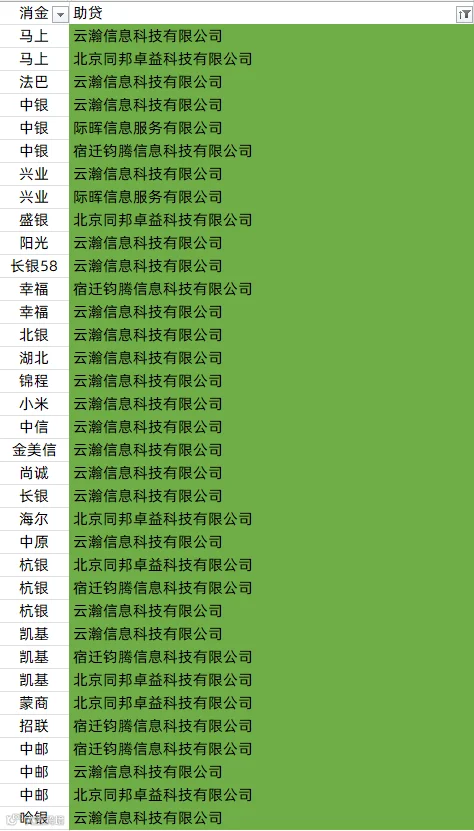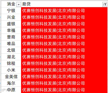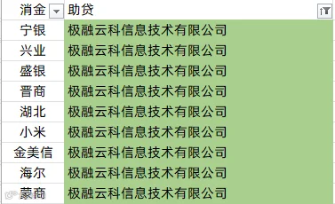 马上消费、南银法巴消金、中银消金、兴业消金、盛银消金、阳光消金、长银五八消金、幸福消金、北银消金、湖北消金、锦程消金、小米消金、中信消金、金美信消金、尚诚消金、长银消金、海尔消金、中原消金、杭银消金、苏银凯基消金、蒙商消金、招联消金、中邮消金、哈银消金