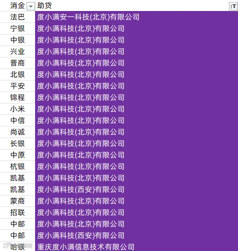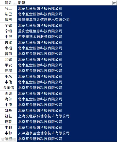马上消费、南银法巴消金、宁银消金、兴业消金、幸福消金、晋商消金、北银消金、平安消金、锦程消金、小米消金、中信消金、金美信消金、尚诚消金、海尔消金、中原消金、苏银凯基消金、招联消金、中邮消金、哈银消金