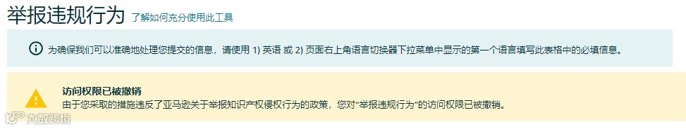 而事实似乎也的确如此,最近有不少卖家在使用投诉功能后收到了【举报违规行为-访问权限已被撤销】的通知,这些卖家中有的仅被撤销投诉功能,还有的在收到通知不久后品牌也被移除了。