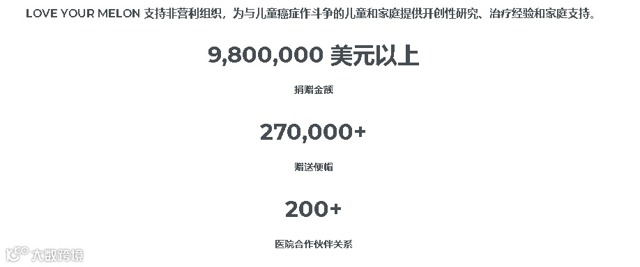 自 2012 年创立以来,在完成最初 45000 顶帽子的初期目标后,此后每售出一件产品, Love Your Melon 就会向世界各地领导抗击儿童癌症的非营利组织捐赠 1 美元。根据 Love Your Melon 官网的介绍,品牌如今已经向多个儿童癌症基金会捐赠超过 980 万美元和 27 万顶帽子。