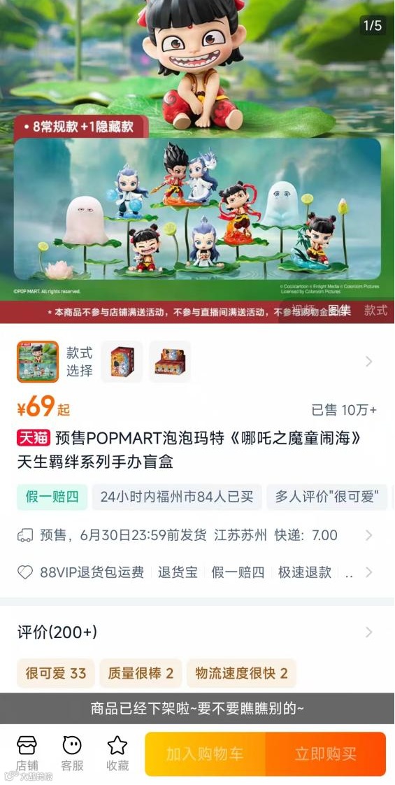 1 月 30 日,泡泡玛特上线“《哪吒之魔童闹海》天生羁绊系列”手办盲盒,该系列包括 8 个常规款和 1 个隐藏款,单个售价为 69 元,整套售价为 552 元。发售以来,该系列盲盒线上线下被一抢而空,出现大范围断货。在天猫平台的泡泡玛特旗舰店,该产品已售卖 10w+,目前已开启线上预售模式,预计将在 6 月 30 日 23 时 59 分前完成发货。