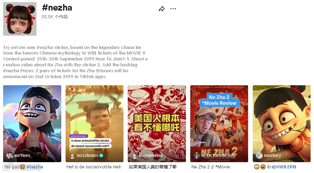 在海外社交媒体 TikTok 上,《哪吒2》的讨论热度持续发酵,为其曝光提供了天然的机会,无论是博主分享剧情解析、观看预告片的 reaction 视频、场景剪辑、搞笑的角色互动还是相关挑战活动的发布,都极大增强了观众的参与感和互动感。截止发稿前,#Nezha 话题标签下相关作品的数量已经突破了 5 万条,大量 UGC 内容发布形成病毒式扩散,电影热度持续升温,IP 效应也在其中不断积累和放大。